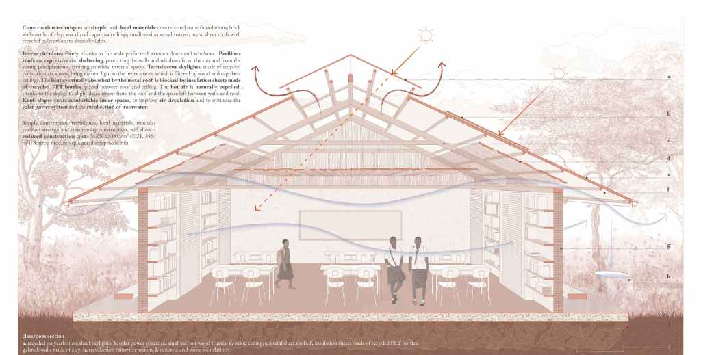 As técnicas construtivas utilizadas são simples, baseadas na utilização de materiais locais: fundações em concreto e pedra; paredes de tijolos feitos de argila; coberturas em madeira (executadas com peças rústicas, com seções reduzidas) complementadas por forros feitos de madeira e de capulanas; telhas metálicas com isolamento térmico e iluminação zenital.
