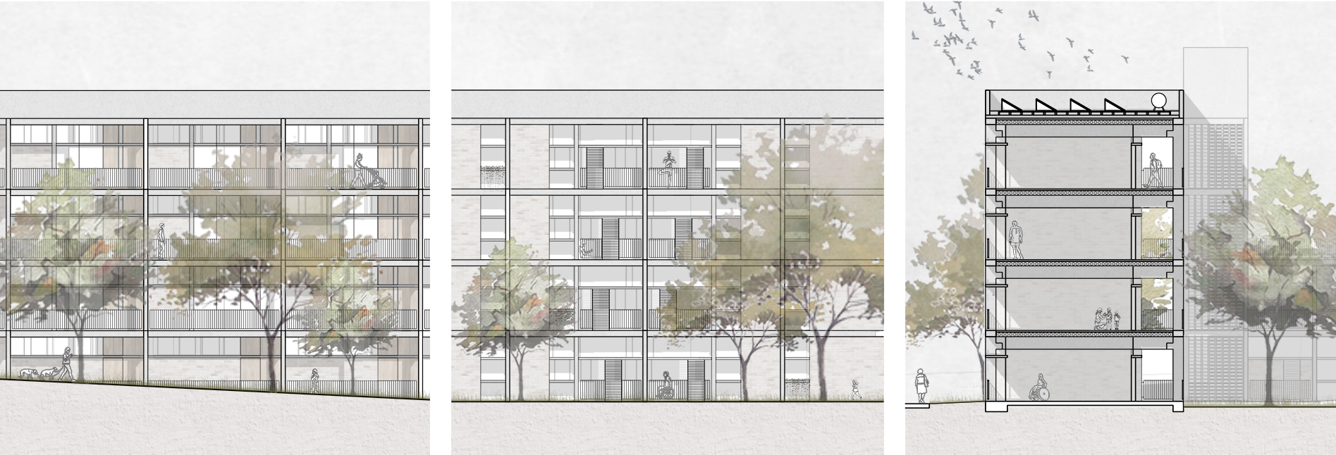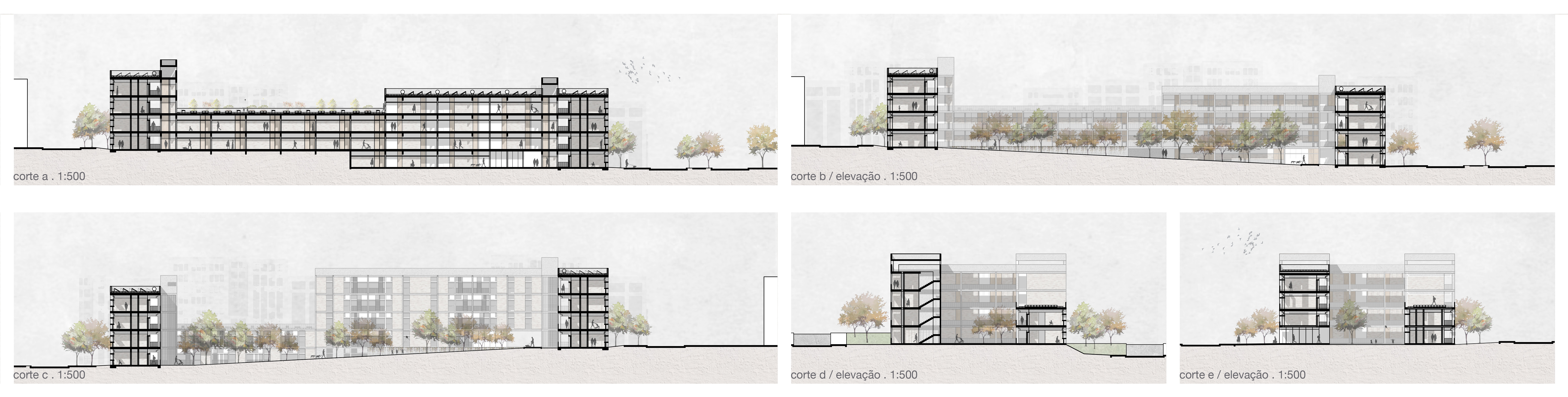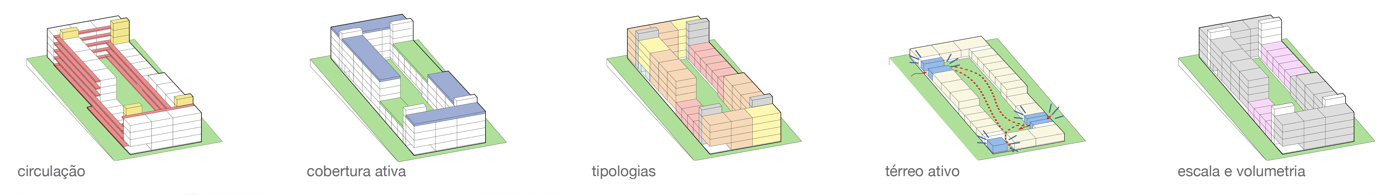a diversidade tipológica, proposta no TR, foi incorporada ao projeto de maneira a também promover diversidade espacial e de escalas e evitar espaços monótonos e ermos. a compacidade do conjunto também facilita a construção e reduz os custos .