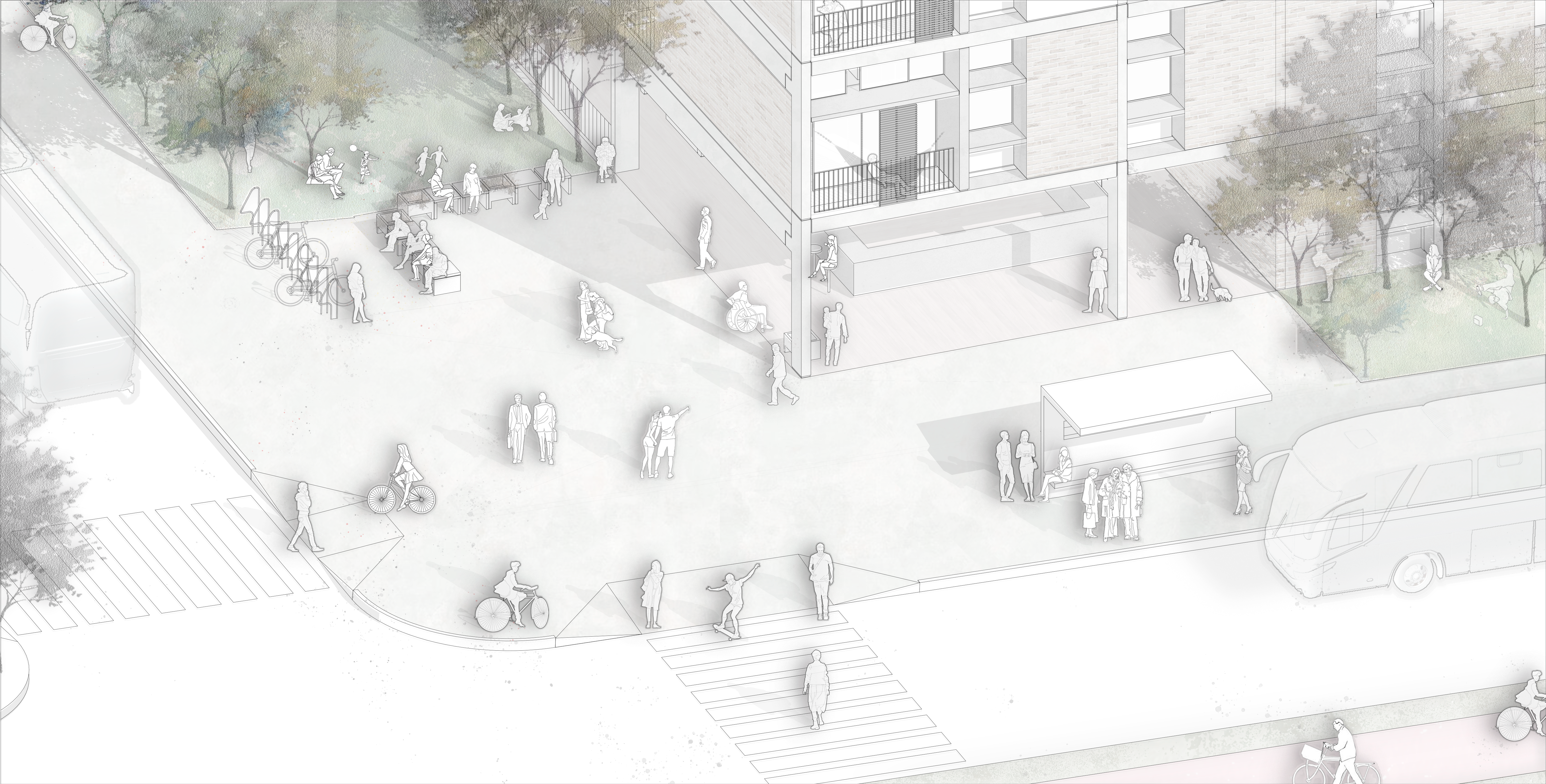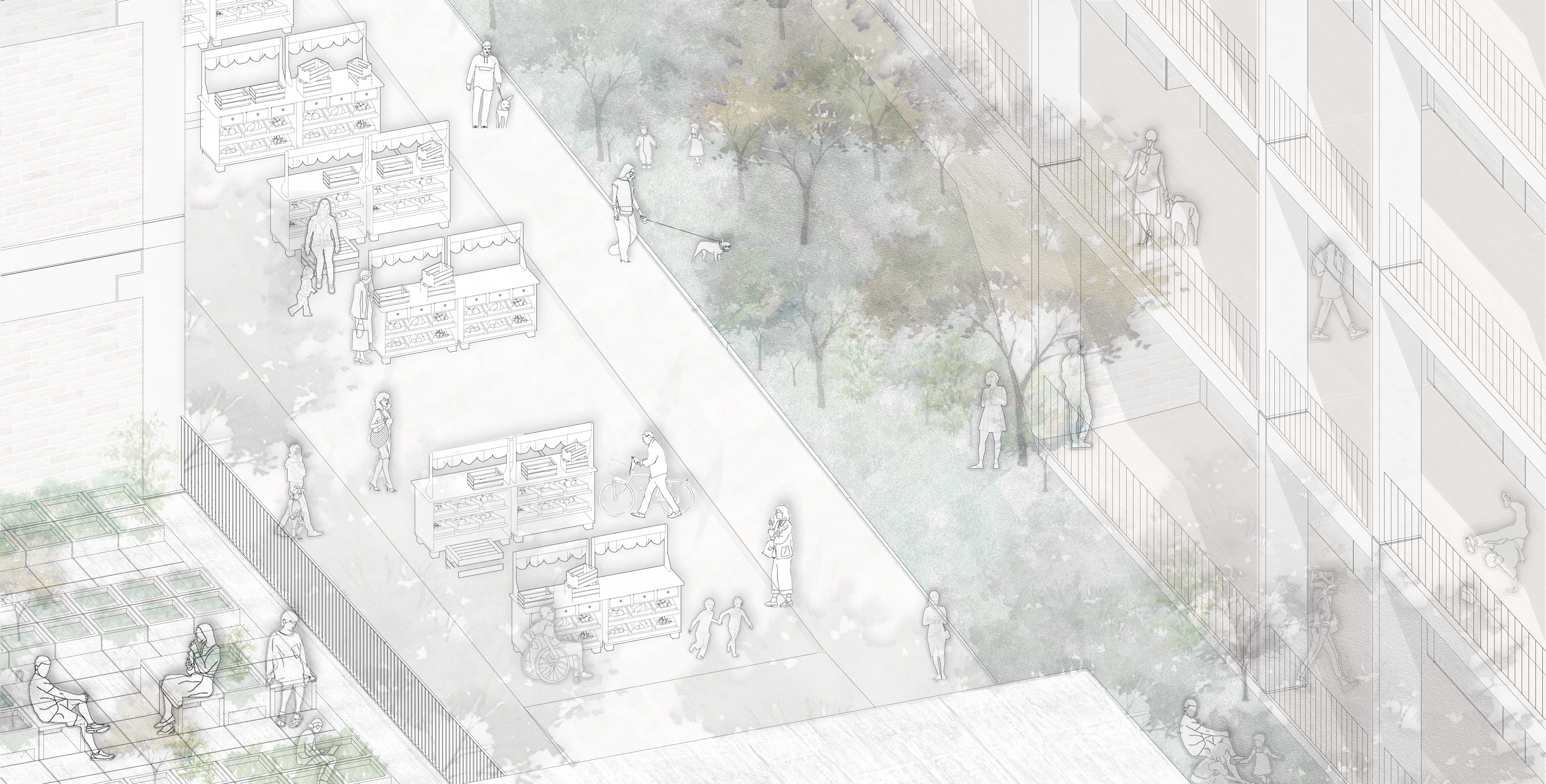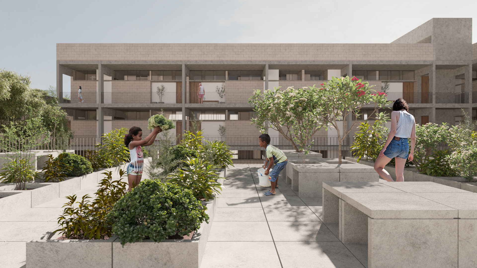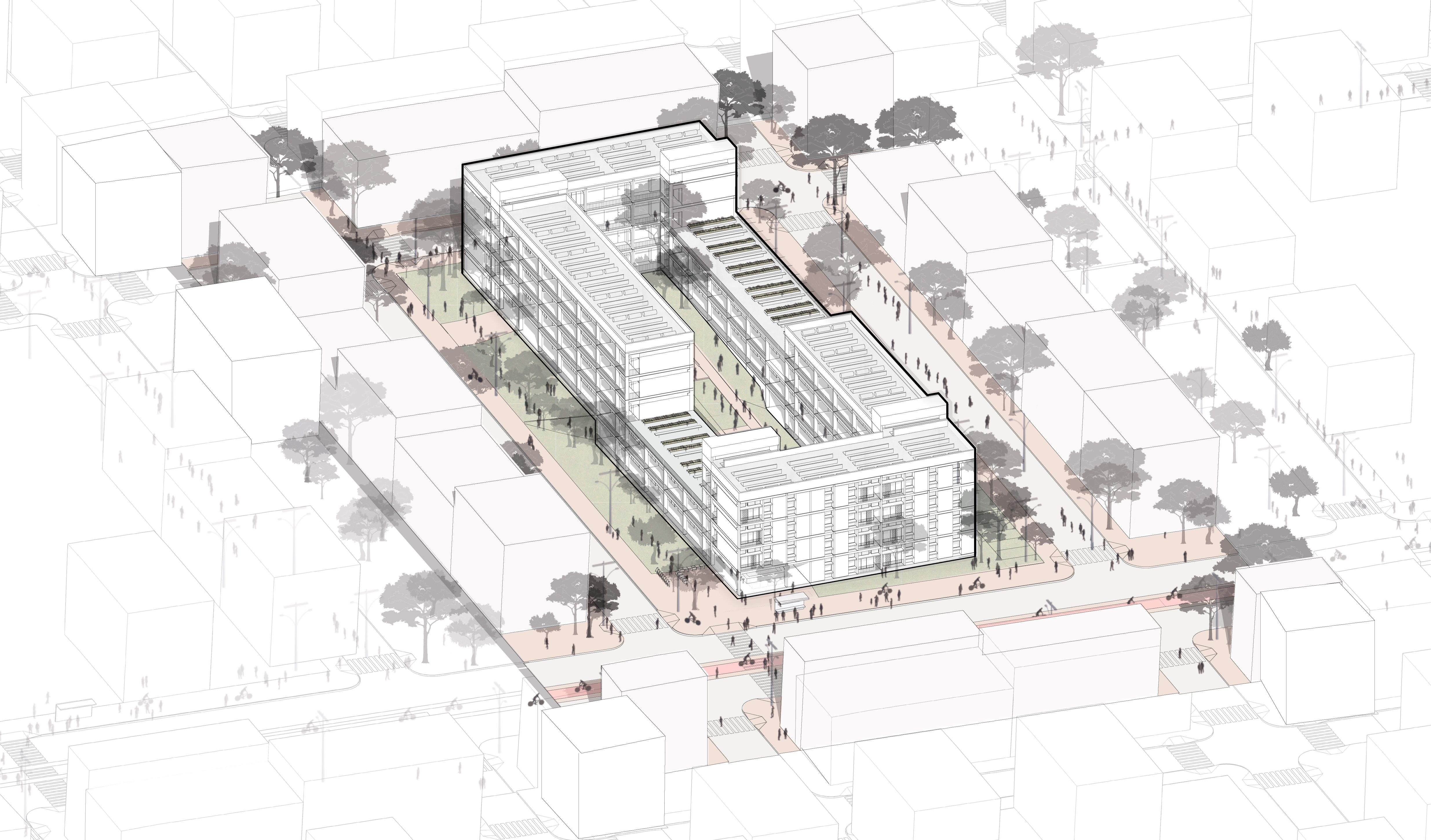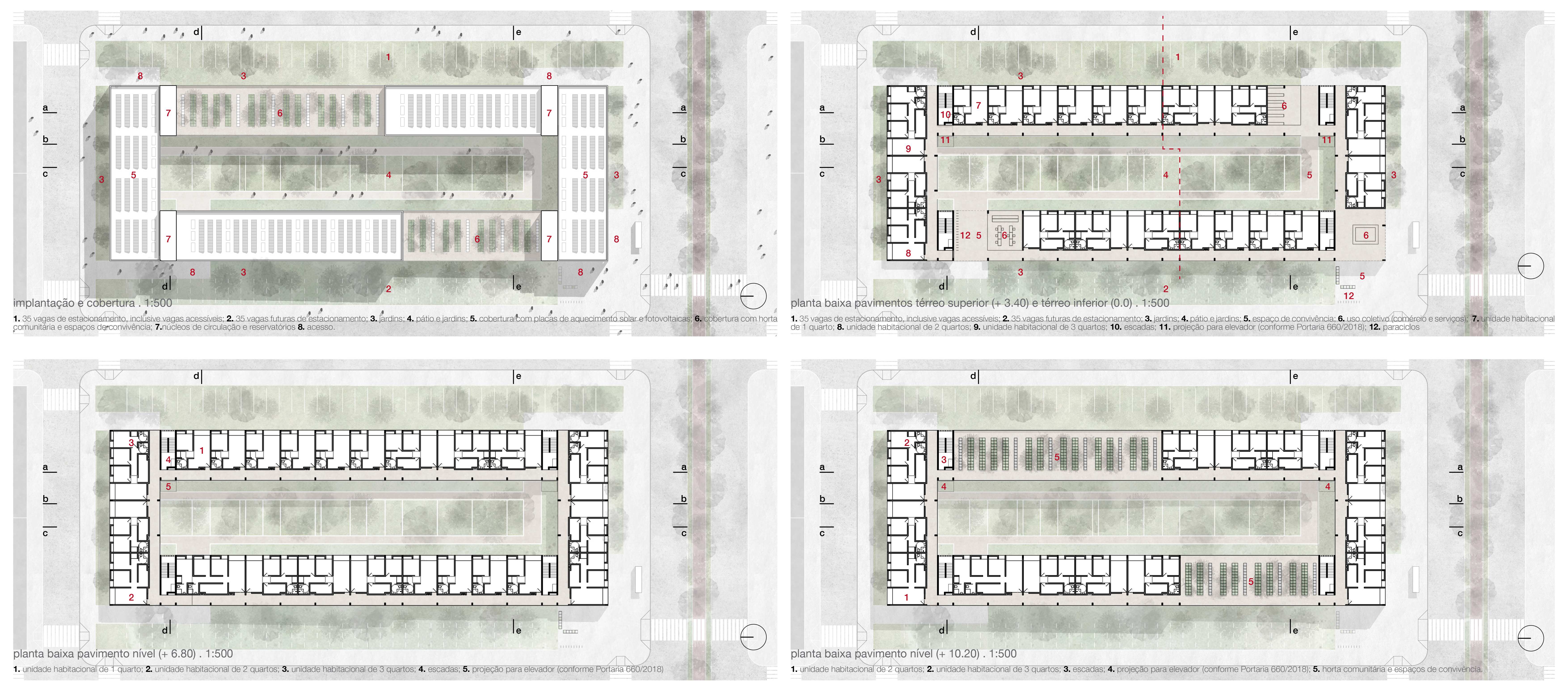 manter os estacionamentos nas bordas do terreno, a fim de promover a apropriação dos espaços pelas pessoas, com pátios internos conectados à vizinhança, pequenas praças, espaços lúdicos, hortas comunitárias, estacionamentos para bicicletas e caminhos sombreados.