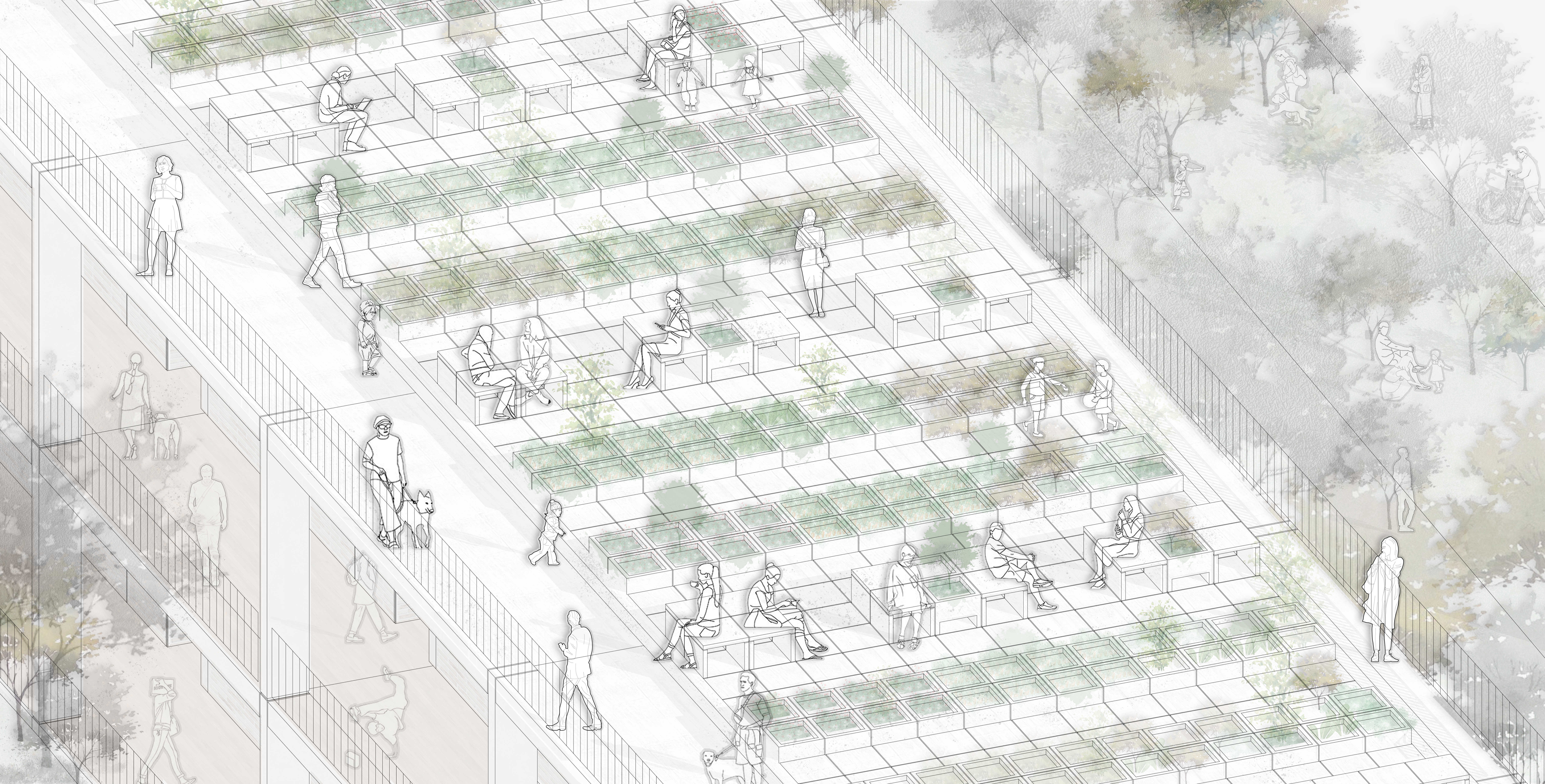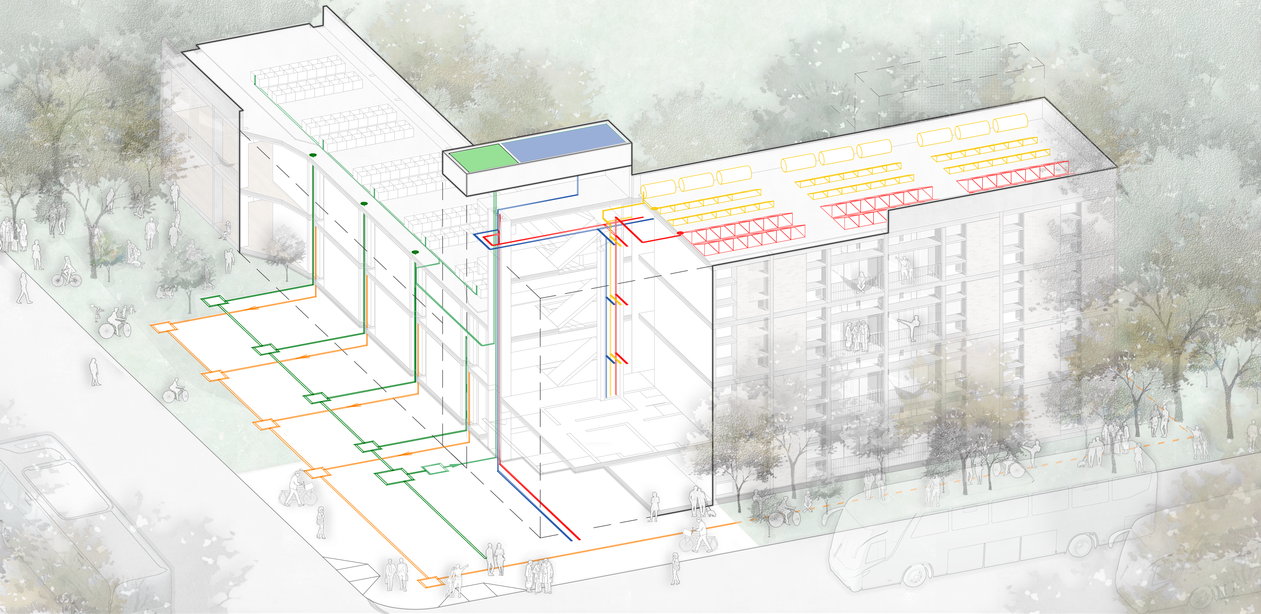 a cobertura, neste projeto, cumpre não apenas a função de abrigo, mas também de espaço potencial para a vida comunitária e práticas sustentáveis. trata-se do conceito de coberturas ativas, com espaços para a instalação de hortas comunitárias, espaços de convivência, infraestrutura de painéis solares e aquecimento de água.