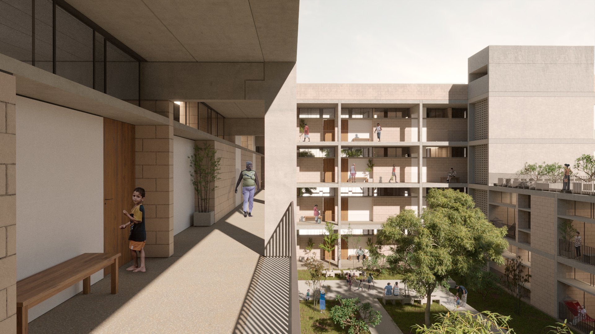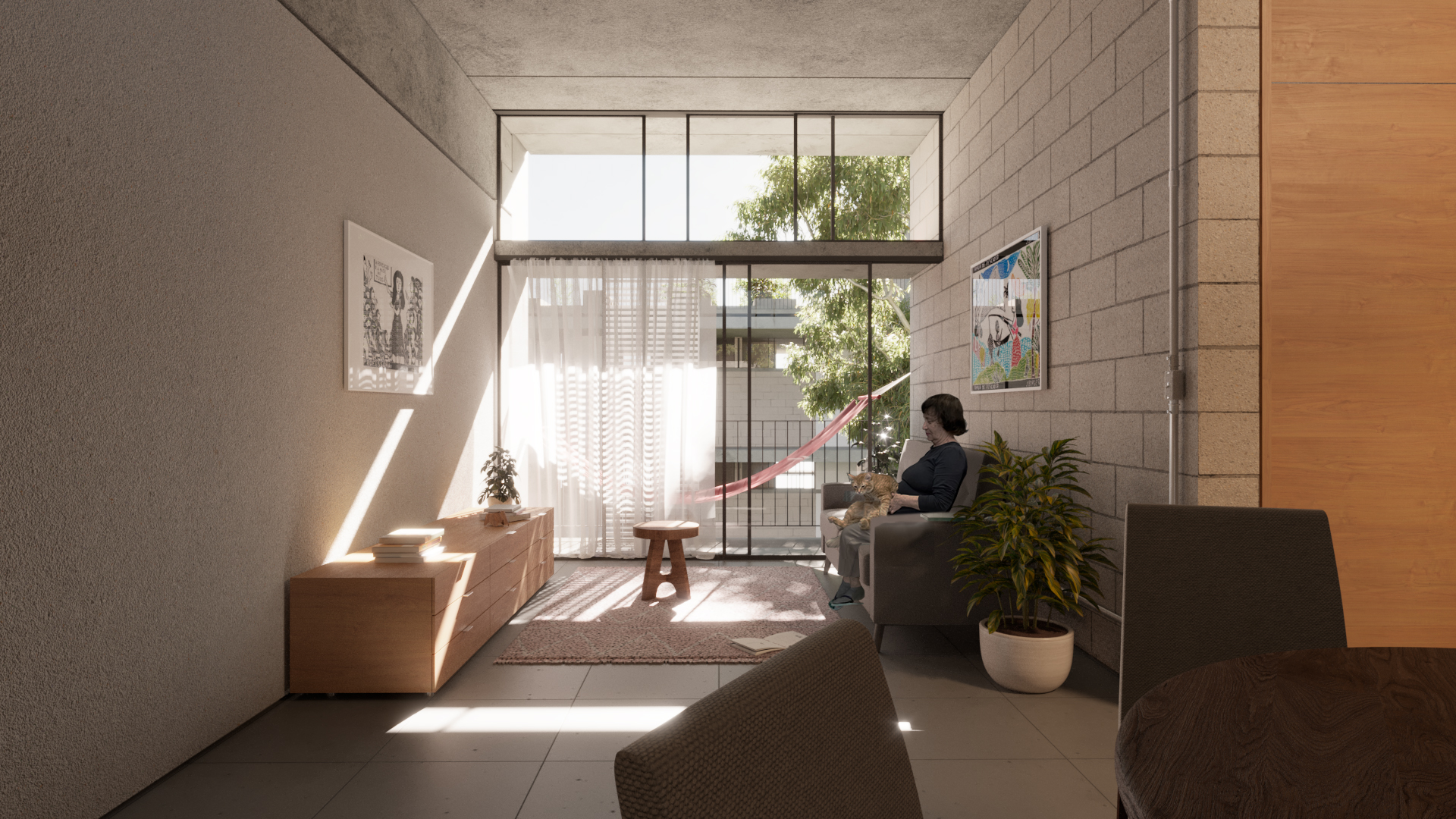 a cultura da cadeira na calçada, no final da tarde, é reinterpretada neste projeto a partir do conceito de calçadas verticais. a circulação horizontal é dimensionada não apenas para atender as demandas mínimas de deslocamento e segurança, mas também para possibilitar a apropriação coletiva. as circulações são sempre abertas às ruas ou aos pátios e permitem a interação comunitária e a conectividade visual entre as unidades de moradia e o entorno.