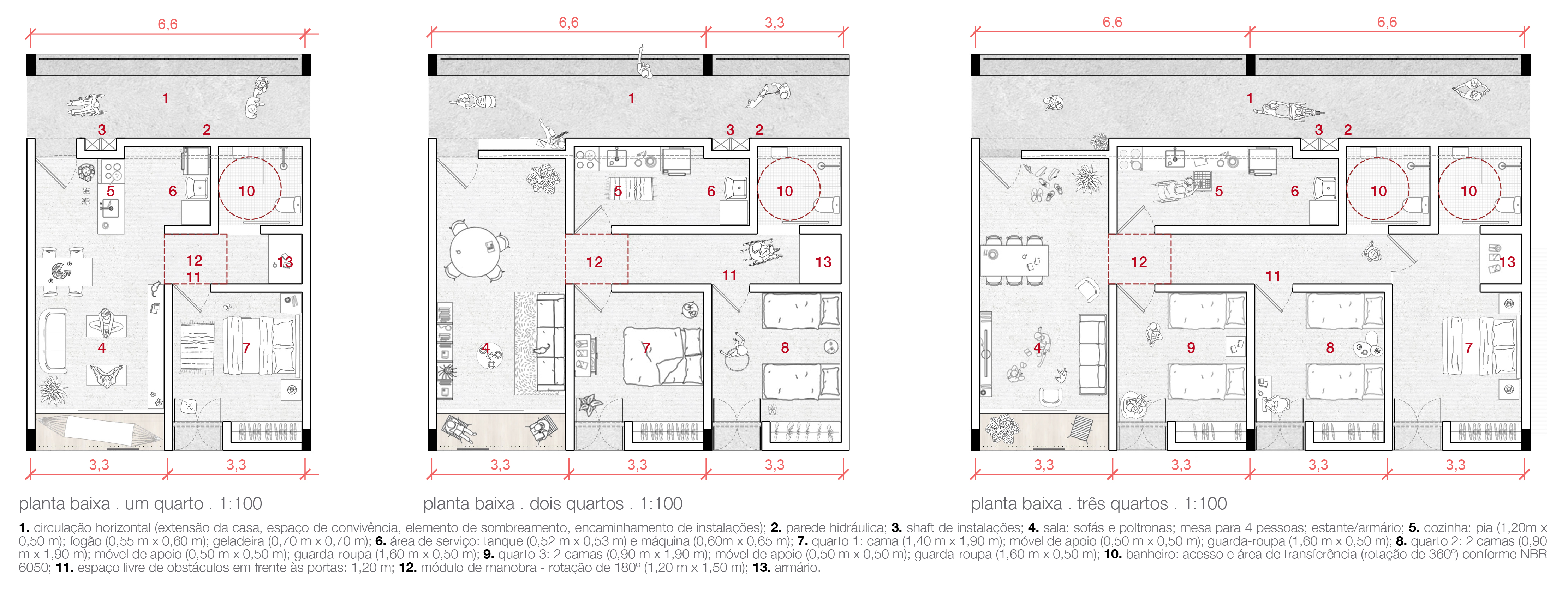 a solução estrutural adotada e a concentração das instalações em parede hidráulica ao longo da circulação permitem total flexibilidade da compartimentação das unidades. as alvenarias não cumprem função estrutural e podem ser retiradas, acrescentadas ou deslocadas conforme a demanda familiar.