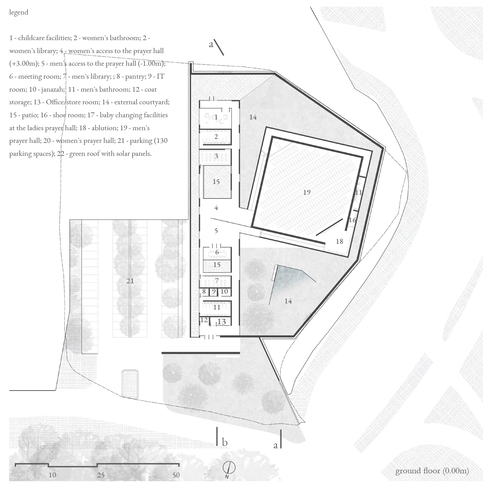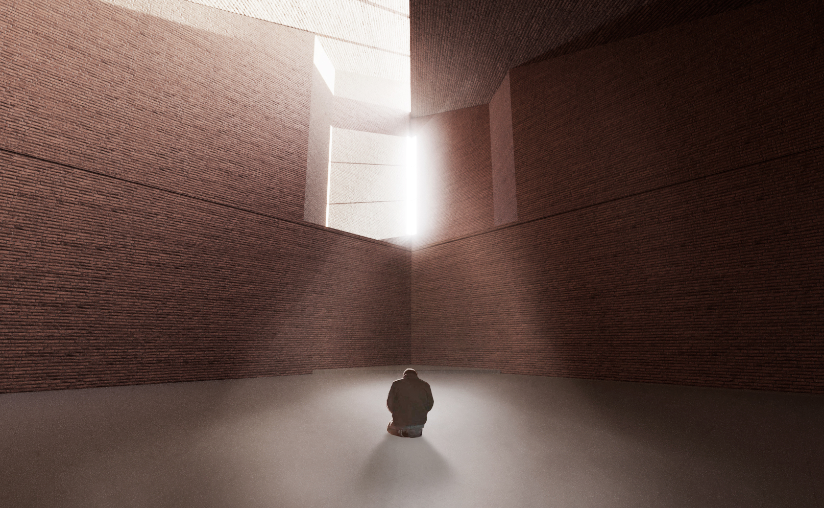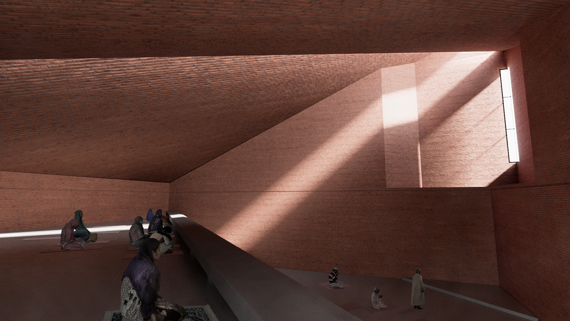 o salão de orações é situado em uma edificação ao mesmo tempo vertical e imersiva: tijolos cerâmicos vermelhos, forma prismática, cujo maior vértice alcança 21 metros, que se ergue em direção a Meca. os espaços de circulação e acesso propõem percursos de transição entre luz e sombra.