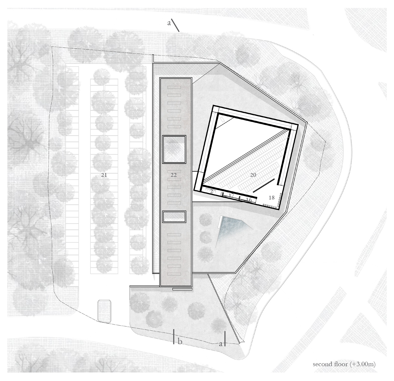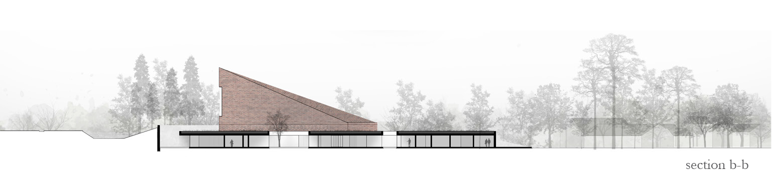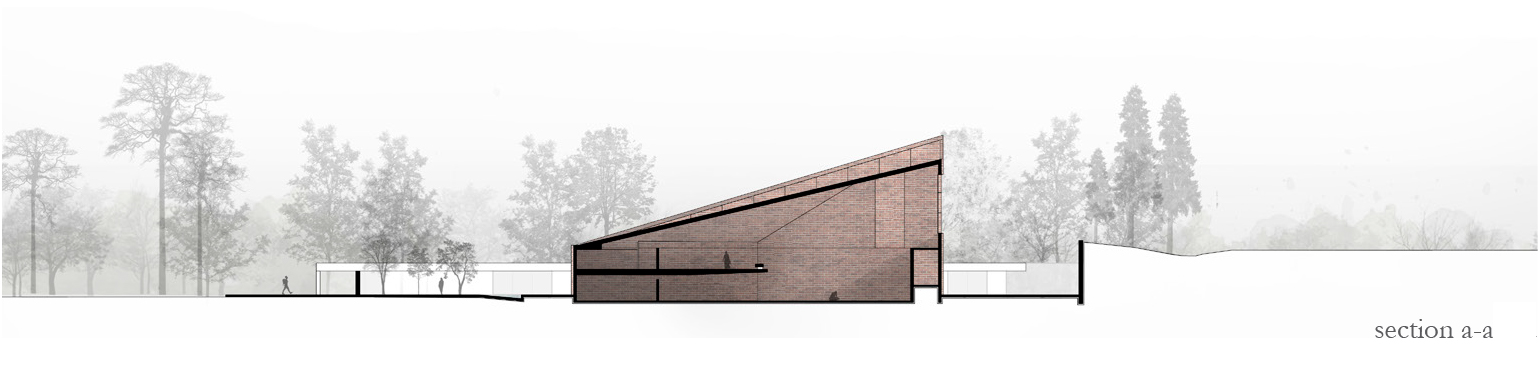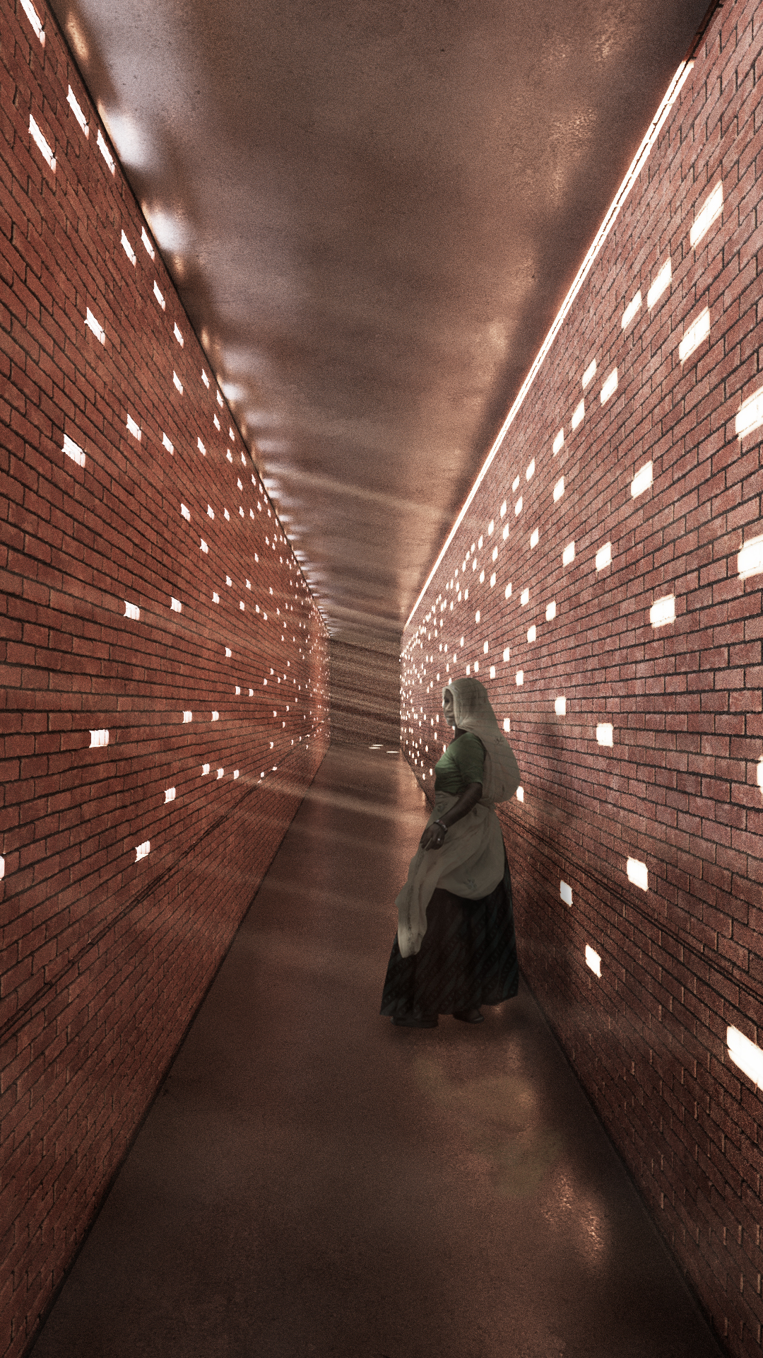 o salão de orações é situado em uma edificação ao mesmo tempo vertical e imersiva: tijolos cerâmicos vermelhos, forma prismática, cujo maior vértice alcança 21 metros, que se ergue em direção a Meca. os espaços de circulação e acesso propõem percursos de transição entre luz e sombra.