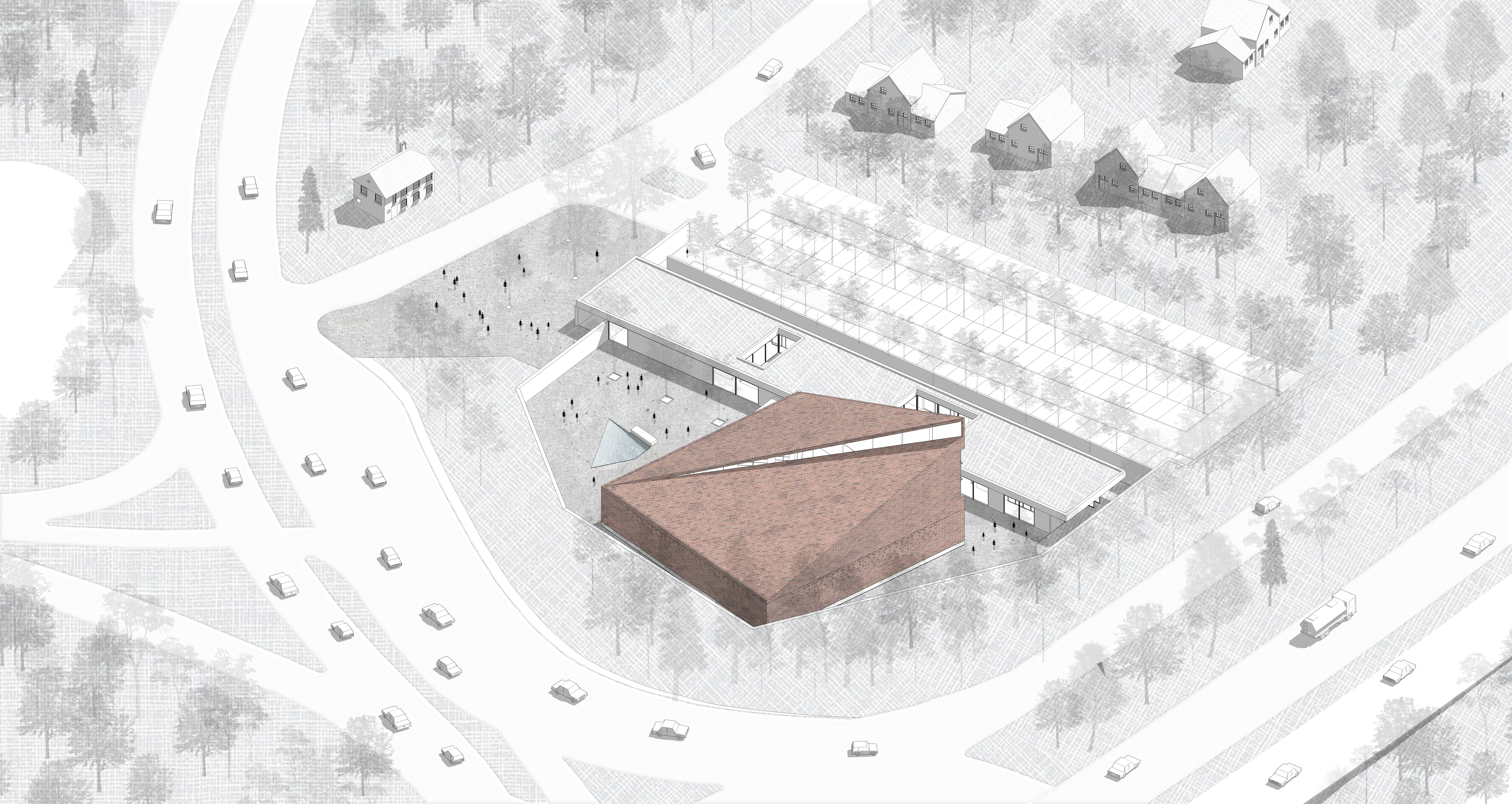 o pavilhão comunitário será um bloco horizontal e discreto, em concreto e pedras naturais e terá a função de abrigar as atividades de apoio da mesquita. projetado como um espaço flexível, serve como transição entre o entorno ruidoso e o silêncio dos espaços de oração.