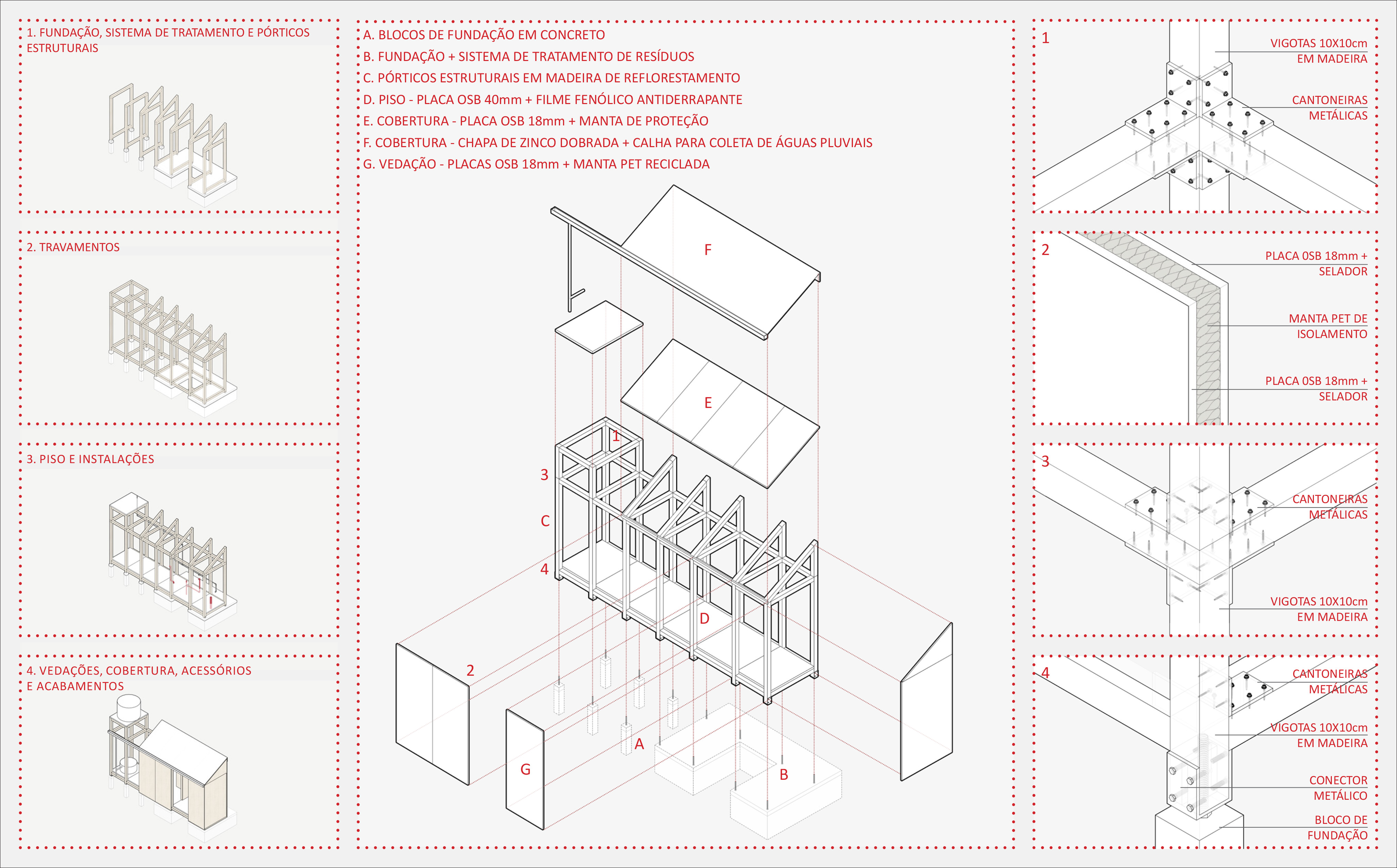 a madeira, enquanto matéria, técnica e cultura construtiva, será o principal elemento de composição do sistema. será utilizada madeira de reflorestamento, com espécies típicas das áreas de reflorestamento do rio grande do sul:pinus, eucalipto e acácia.